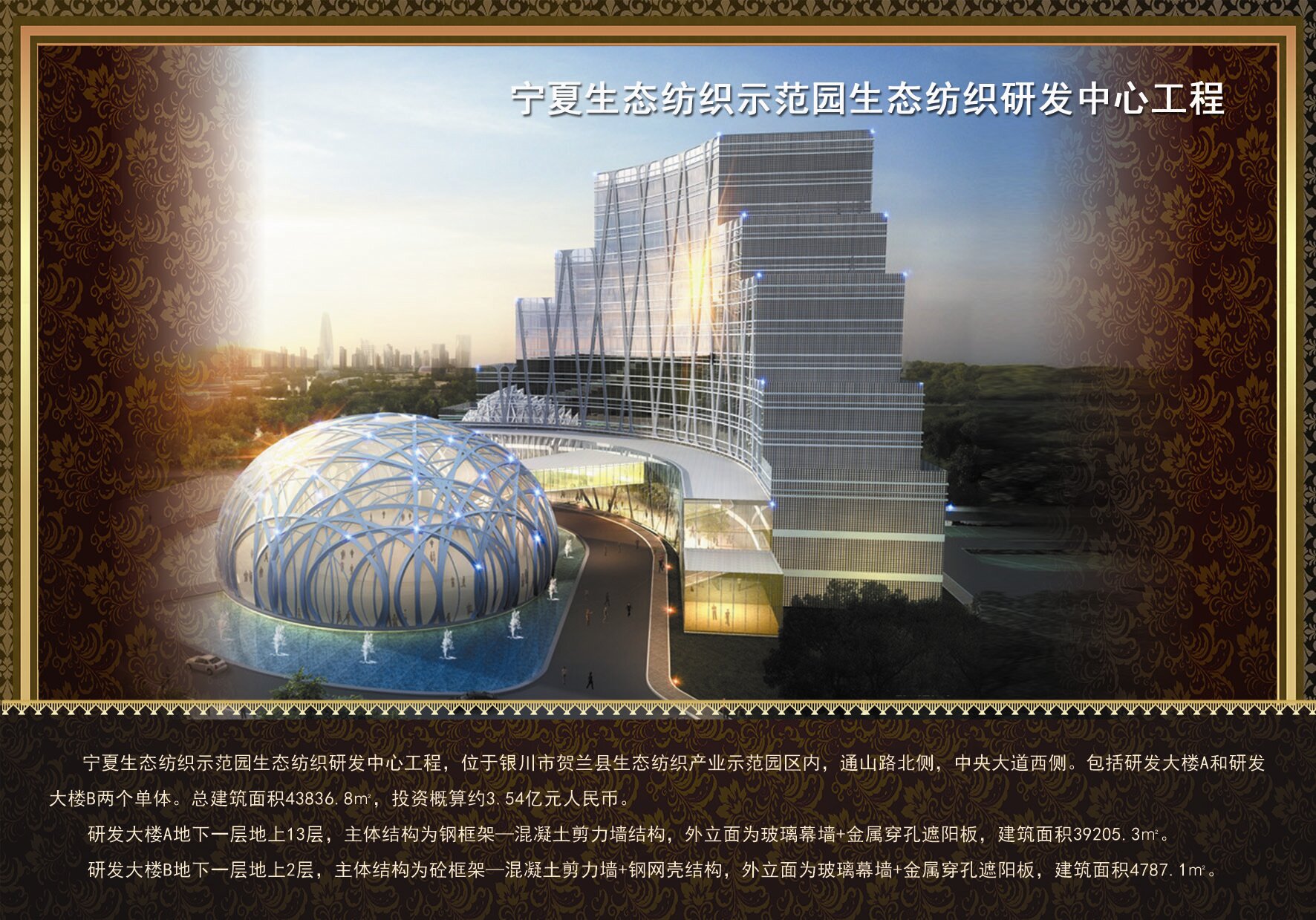 寧夏生態紡織示范園生態紡織研發中心工程 ,位于銀川賀蘭縣生態紡織產業示范園區內,通山路北側,中央大道西側。包括研發大樓研發大樓B兩個單體?偨ㄖ娣e43836.8平方米,投資概算約3.54億元人民幣。