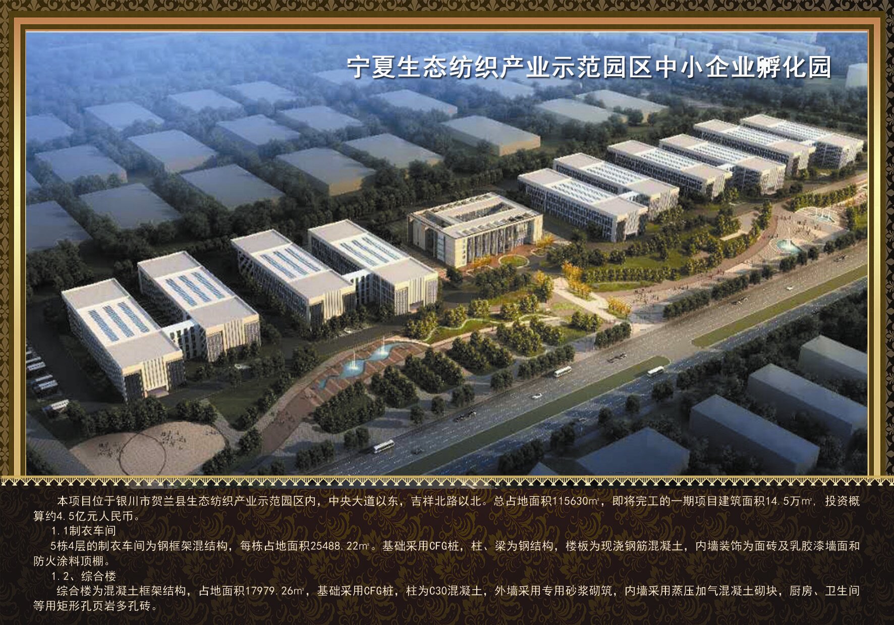 本項目位于銀川市賀蘭縣生態紡織產業示范園區內,中央大道以東、吉祥北路以北?傉嫉孛娣e115630平方米,即將完工的一期項目建筑面積14.5萬平方米,投資概算約4.5億元人民幣。